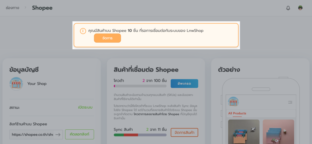 - เข้ามาที่หน้าระบบจัดการ Shopee จะพบกล่องสินค้ารอเชื่อมต่อ คลิก จัดการ