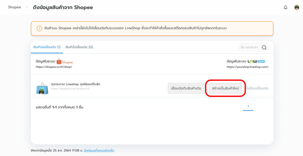- คุณจะพบสินค้าที่มีอยู่บน Shopee แต่ยังไม่ได้เชื่อมต่อกับ LnwShop Pro คลิกที่ปุ่ม สร้างเป็นสินค้าใหม่ ในสินค้าชิ้นที่ต้องการดึงข้อมูลมาสร้างเป็นสินค้าใหม่บน LnwShop Pro