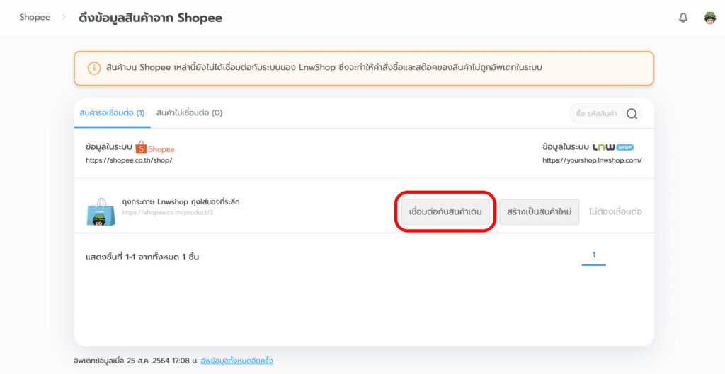- คุณจะพบสินค้าที่มีอยู่บน Shopee แต่ยังไม่ได้เชื่อมต่อกับ LnwShop Pro คลิกที่ปุ่ม เชื่อมกับสินค้าเดิม ในสินค้าชิ้นที่ต้องการเชื่อมต่อกับสินค้าที่มีอยู่แล้วบน LnwShop Pro