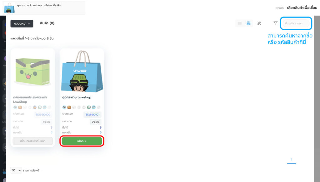 - เลือกสินค้าบน LnwShop Pro ที่ต้องการเชื่อมต่อกับสินค้าชิ้นนั้นๆ จากนั้นกด เลือก (สามารถค้นหาสินค้าจากชื่อ/รหัสสินค้าในช่องค้นหา)