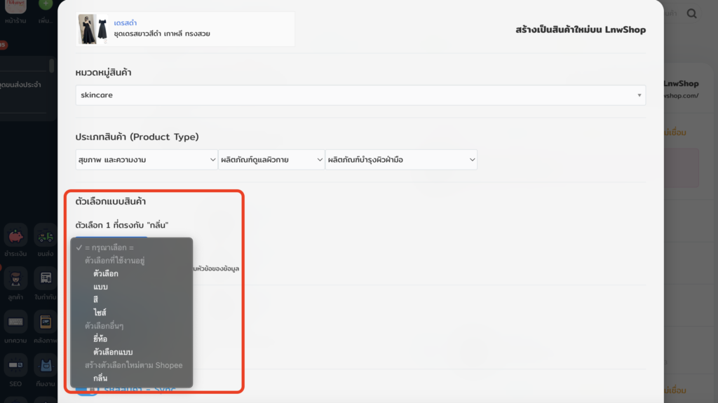 ** กรณีสินค้าตัวเลือกแบบ คุณต้องเชื่อมหัวข้อตัวเลือกแบบของ Shopee เข้ากับหัวข้อของ LnwShop เช่น สี เชื่อมกับ สี ทั้งนี้ หากไม่มีหัวข้อที่ต้องการใช้งาน คุณสามารถเลือกดึงหัวข้อตัวเลือกจาก Shopee มาสร้างใหม่ที่ LnwShop หรือ เพิ่มหัวข้อข้อมูลสินค้า ได้เอง