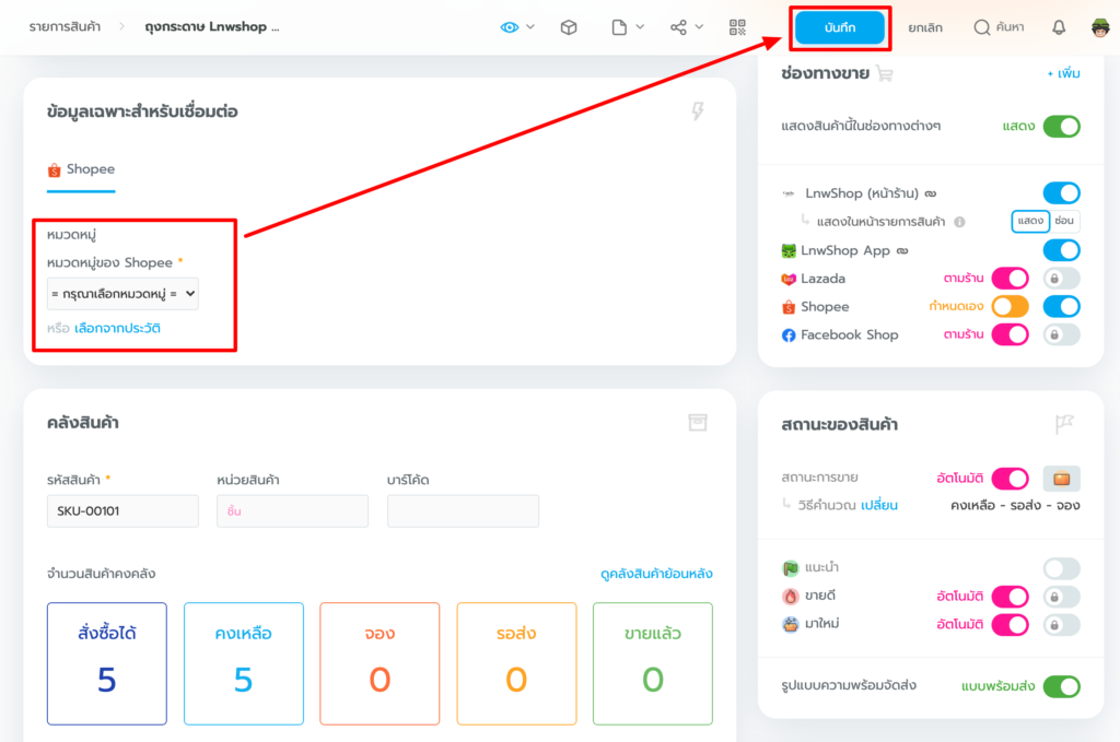 เมื่อเข้ามาที่หน้า แก้ไขสินค้า ให้แก้ไขข้อมูลสินค้าตามรายละเอียดข้อผิดพลาด เช่น กรุณากำหนดหมวดหมู่ของ Shopee ในสินค้านี้ จากนั้นกด บันทึก