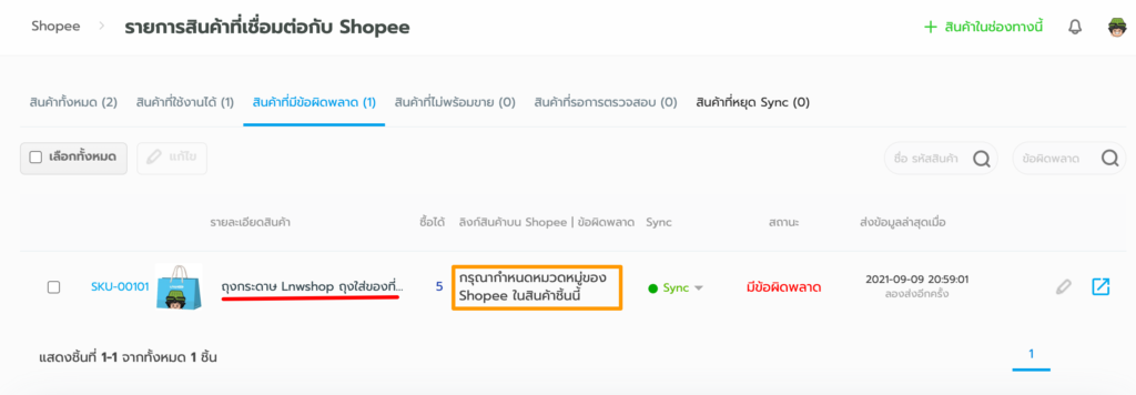 - มีข้อผิดพลาด : สินค้ามีข้อผิดพลาดในการเชื่อมต่อ อาจเกิดได้จากข้อมูลสินค้าที่ไม่ครบถ้วน หรือข้อมูลไม่เป็นไปตามนโยบายของ Shopee