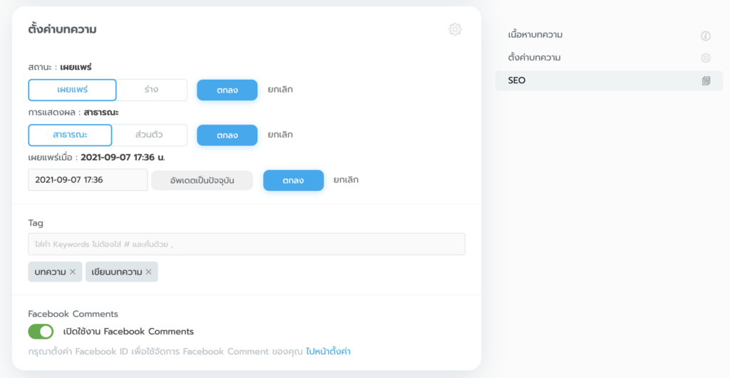 2. เผยแพร่เมื่อ : เวลาที่ต้องการให้แสดงบทความ (ตั้งเวลาล่วงหน้า หรือปรับเวลาเพื่อจัดเรียงบทความ)