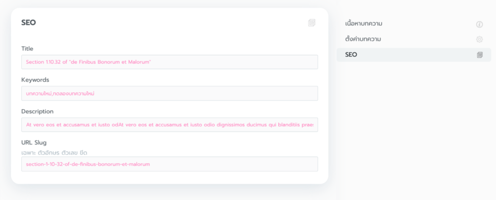 ส่วนนี้ระบบจะทำการดึงข้อมูลในบทความที่เหมาะสม มาเป็นค่าเริ่มต้นของ SEO ในส่วนต่าง ๆ ให้โดยอัตโนมัติ แต่คุณสามารถปรับค่าได้เองตามต้องการ ทั้ง Title, Keywords, Description และ URL Slug