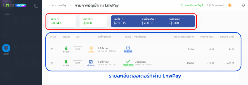 เมื่อระบบเปิดใช้งานเรียบร้อยแล้ว คุณสามารถเข้าไปที่ระบบจัดการ LnwShop Pro > คลิกเมนู LnwPay > รายการบัญชีผ่าน LnwPay เพื่อดูข้อมูลรายการสั่งซื้อ และค่าธรรมเนียมที่ถูกหักผ่านเทพเพย์ได้ โดยมีสถานะดังนี้
