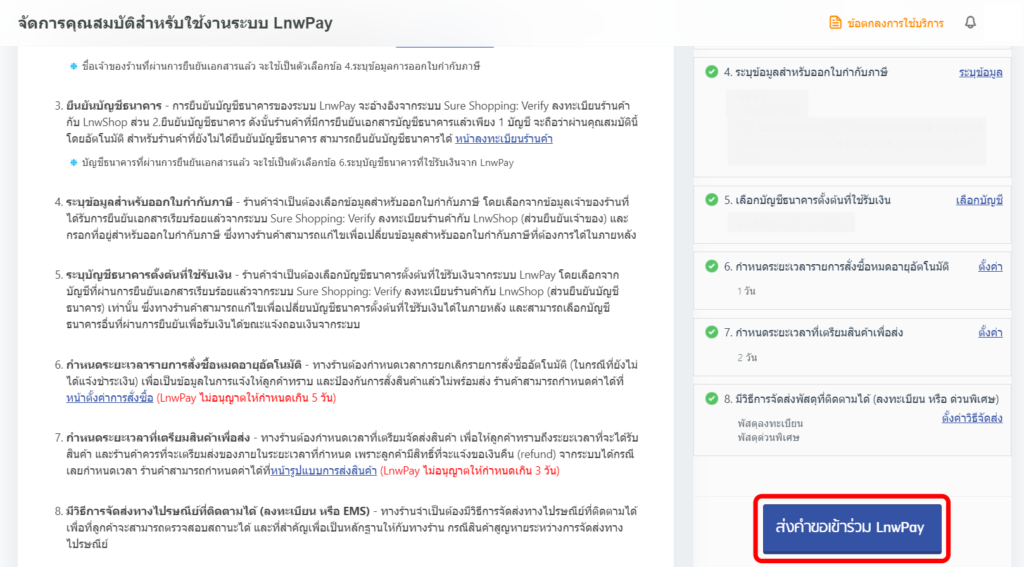4. จัดการคุณสมบัติ ให้ครบทุกข้อ และกดปุ่ม ส่งคำขอเข้าร่วม LnwPay