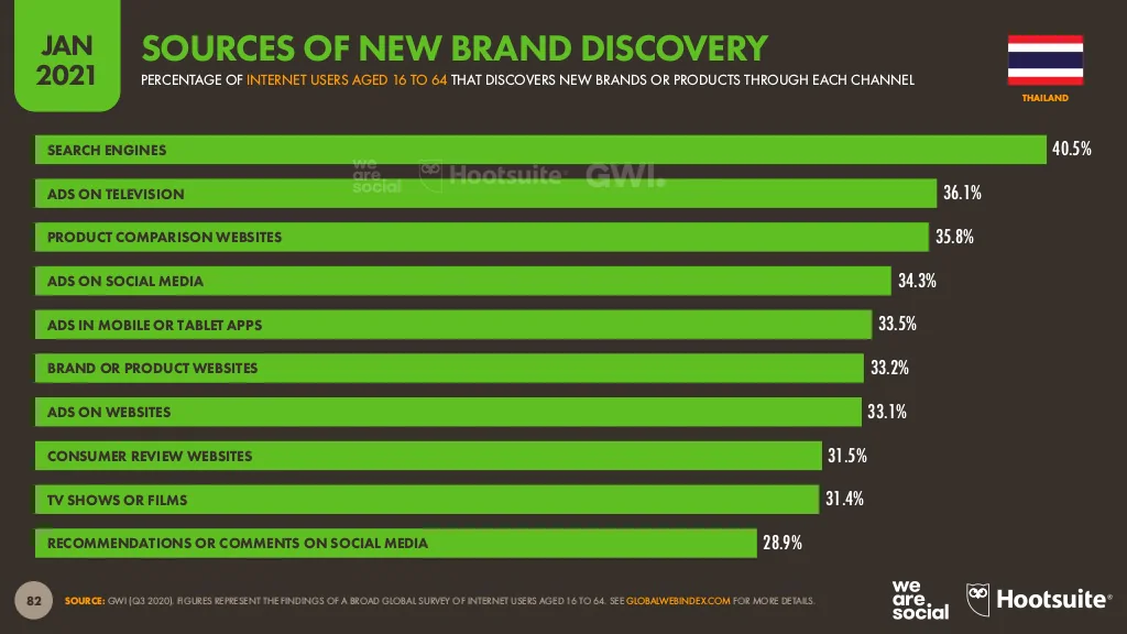 15. ผู้ใช้งานอินเตอร์เน็ตในไทย ค้นพบแบรนด์ใหม่ ๆ สินค้าใหม่ ๆ จาก Search Engines เป็นอันดับหนึ่ง รองลงมาคือ โฆษณาในทีวี และ เว็บเปรียบเทียบสินค้าตามลำดับ