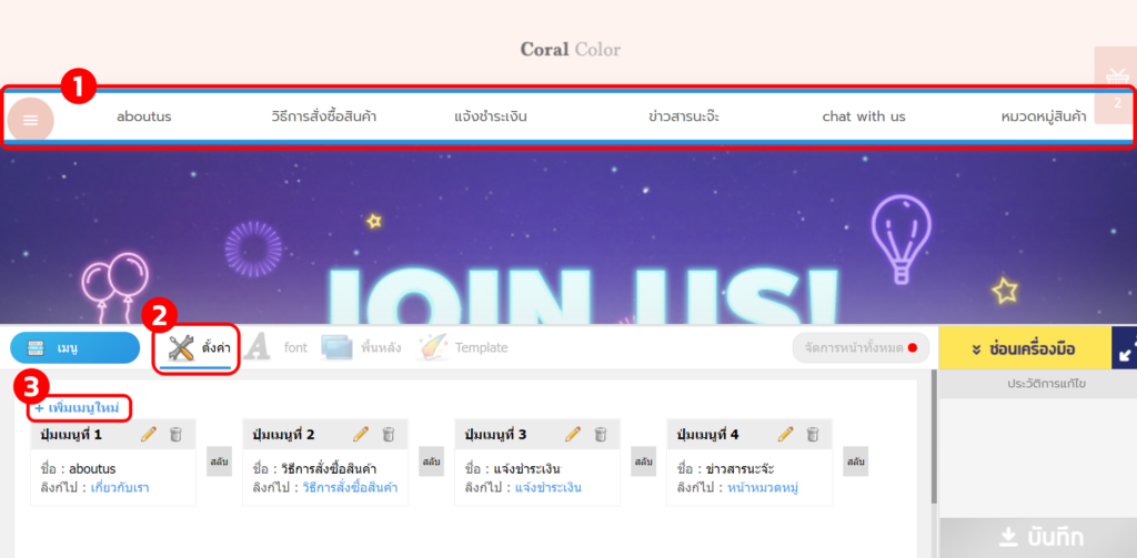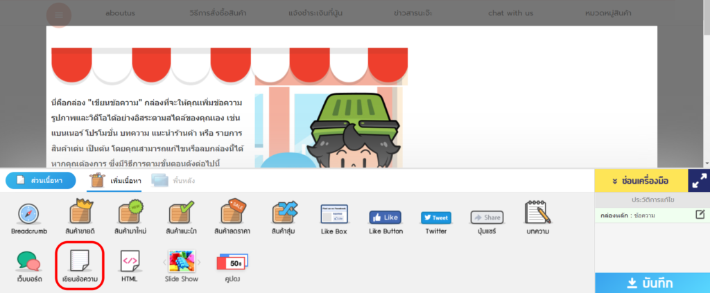 คุณสามารถตกแต่งหน้าตาของเพจได้ ผ่านเครื่องมือ แต่งหน้าร้าน ที่หน้าเว็บไซต์