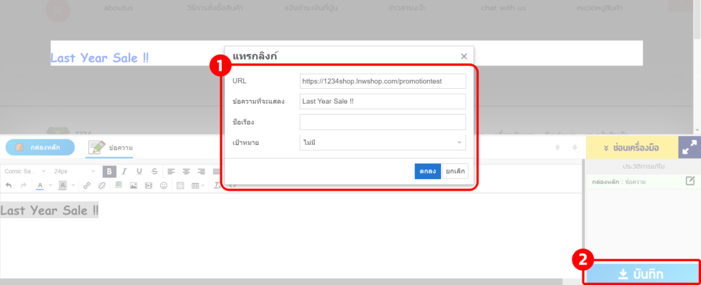 4. นำลิงก์ของหน้าเพจที่ต้องการมาใส่ในช่อง URL และกำหนดข้อมูลส่วนอื่นๆ > กดตกลงและบันทึก