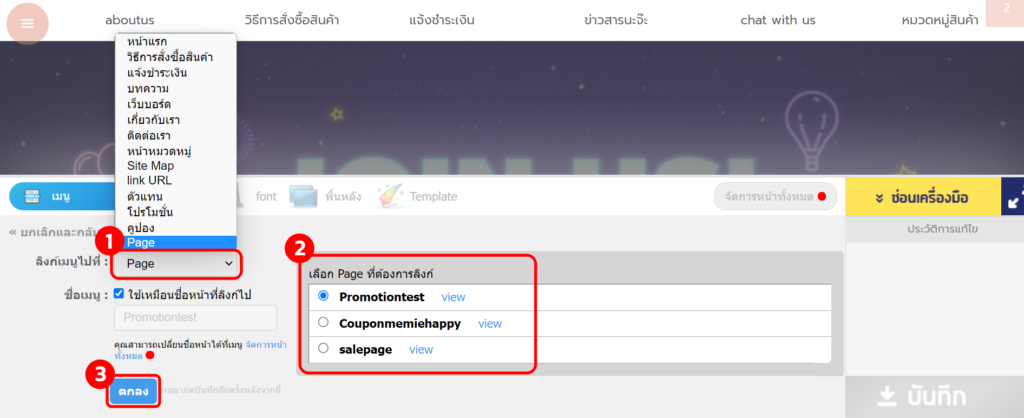 เป็นการเพิ่มหัวข้อของเพจเข้าไปที่แถบเมนูหลัก ให้ลูกค้าคลิกดูเพจจากหน้าเว็บไซต์ได้ทันที วิธีการดังนี้