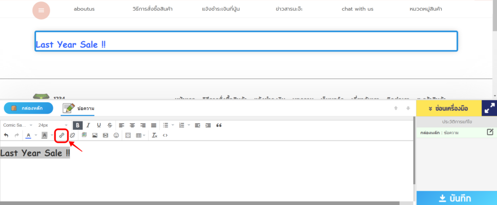 3. ลบกล่องข้อความตัวอย่างออก และแก้ไขข้อความหรือเพิ่มรูปภาพ จากนั้นนำเม้าส์ลากคลุมข้อความ/รูปภาพที่ต้องการฝังลิงก์ และคลิกเมนู แทรก/แก้ไขลิงก์