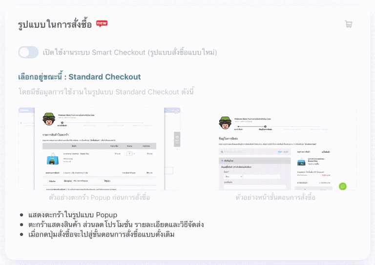 คุณสามารถเลือกรูปแบบการสั่งซื้อสินค้าบนหน้าเว็บไซต์ได้ 2 แบบ คือ Standard Checkout (รูปแบบการสั่งซื้อเดิม) หรือหากต้องการใช้งานแบบ Smart Checkout (รูปแบบการสั่งซื้อใหม่) สามารถคลิกที่เมนูเปิดใช้งาน