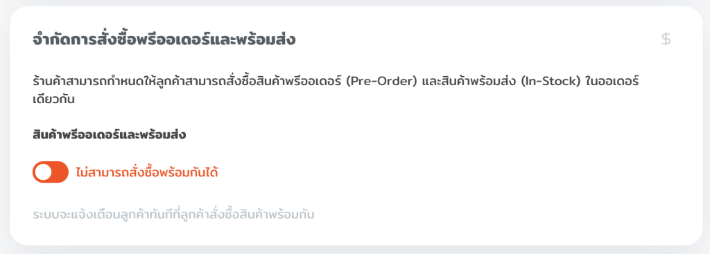 สามารถกำหนดให้ลูกค้า ไม่สามารถสั่งซื้อสินค้าพรีออเดอร์ (Pre-Order) และสินค้าพร้อมส่ง (In-Stock) ในออเดอร์เดียวกัน หากลูกค้าสั่งซื้อสินค้าสองประเภทพร้อมกัน ระบบจะแจ้งเตือนในหน้าบิลอัตโนมัติ