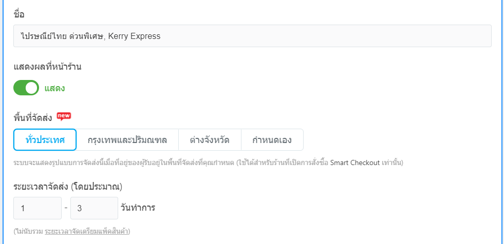 - พื้นที่จัดส่ง เพื่อกำหนดพื้นที่ในการส่งของรูปแบบขนส่งนี้ (คลิกดูวิธีการกำหนดพื้นที่จัดส่งที่นี่)