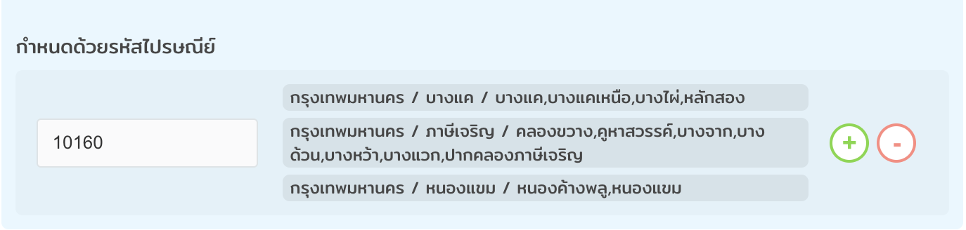 นอกจากนี้ หากเลือกกำหนดเอง คุณสามารถกำหนดพื้นที่ด้วยรหัสไปรษณีย์ได้เช่นกัน โดยจะครอบคลุมทุกตำบล/อำเภอ ของรหัสไปรษณีย์นั้น ๆ
