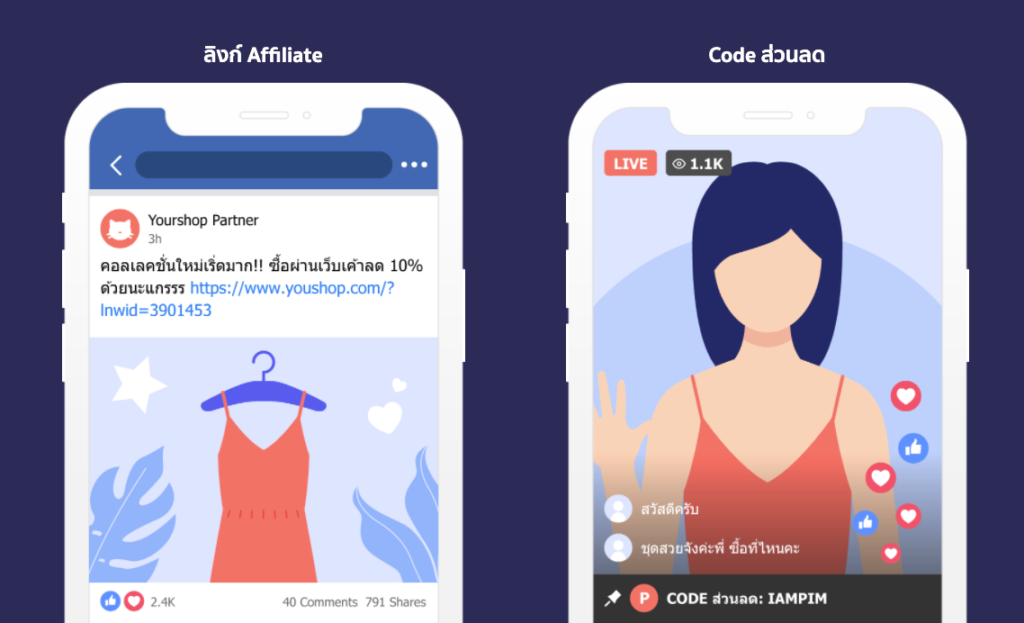 - ใช้ลิงก์ Affiliate โดย Link Affiliate คือ ลิงก์ที่สามารถ track ได้ว่าลูกค้าที่ซื้อของไป มีพาร์ทเนอร์คนไหนเป็นคนแนะนำ เมื่อลูกค้าเข้ามาแล้วซื้อของผ่านลิงก์นี้ พาร์ทเนอร์เจ้าของลิงก์จะได้รับค่าคอมมิชชั่น