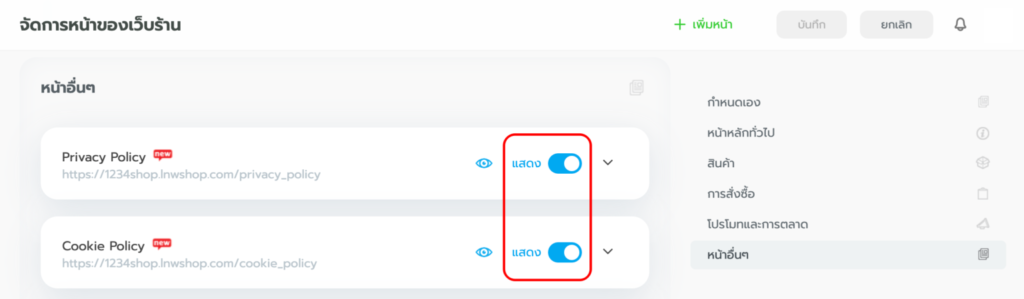 1. คลิก จัดการหน้าเว็บของร้าน หรือคลิกที่แต่ละนโยบายที่ต้องการแก้ไข