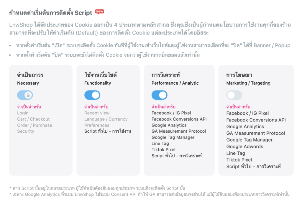 2. กำหนดค่าเริ่มต้นการติดตั้ง Script คุณสามารถกำหนดนโยบายการใช้งานคุกกี้แต่ละประเภทได้เอง โดยหากเลือก เปิด ระบบจะติดตั้งคุกกี้นั้นทันทีที่ลูกค้าเข้าสู่เว็บไซต์ ซึ่งลูกค้าสามารถกดปิดการยินยอมใช้งานคุกกี้ที่ Banner ในภายหลังได้ แต่หากคุณตั้งค่า ปิด ระบบจะไม่ติดตั้งคุกกี้นั้น ๆ จนกว่าลูกค้าจะกดยินยอมแล้วเท่านั้น ซึ่งการตั้งค่าคุกกี้มี 4 ประเภท ได้แก่