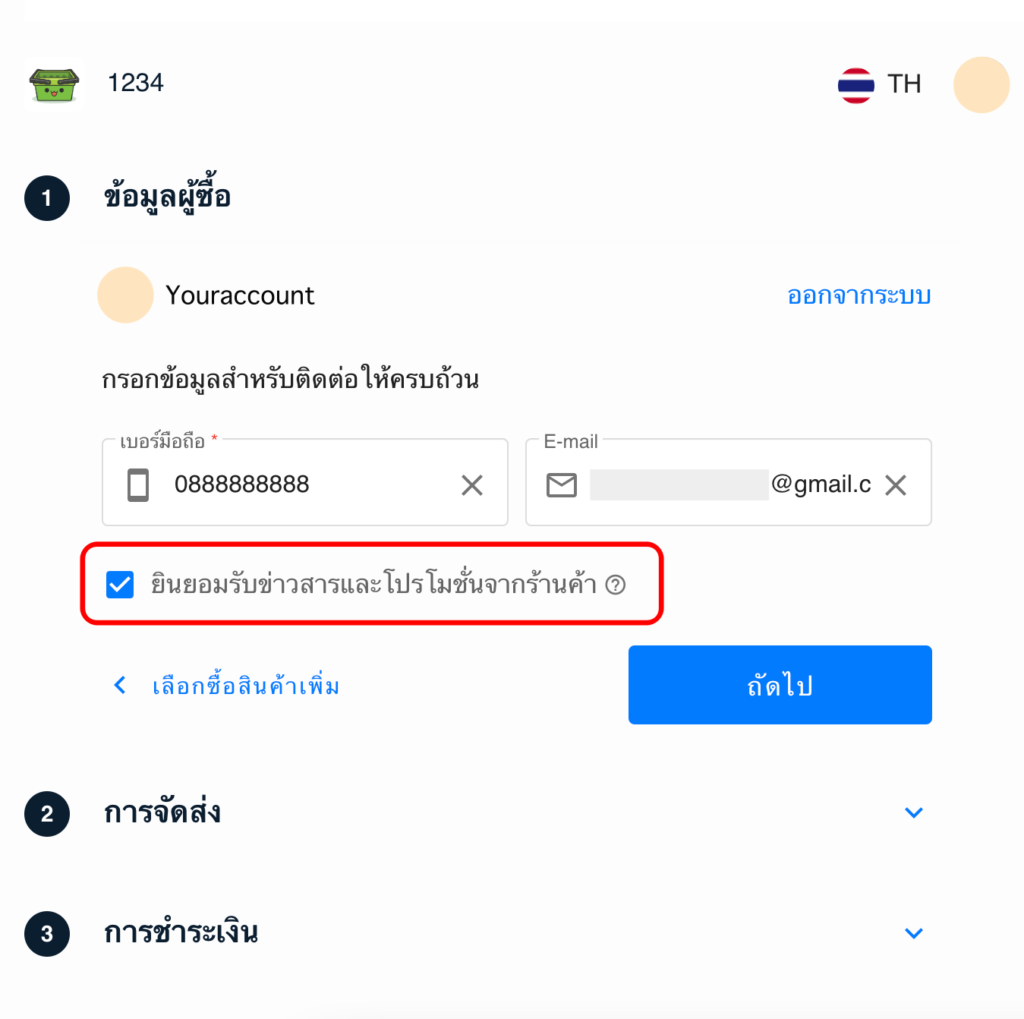 และนอกเหนือจากการตั้งค่า Policy ต่าง ๆ และ Cookie Banner แล้ว ในกรณีที่ลูกค้ากรอกข้อมูลส่วนตัวสำหรับการสั่งซื้อ เช่น ชื่อ ที่อยู่ เบอร์โทรศัพท์ อีเมล เป็นต้น ระบบก็จะแสดงช่องลูกค้าสามารถทำเครื่องหมาย ✔ ยินยอมรับข่าวสารและโปรโมชั่นจากร้านค้า ที่หน้าบิลออนไลน์ เพื่อให้สามารถนำข้อมูลลูกค้าไปใช้ในการทำการโฆษณาหรือทำการตลาดอื่น ๆ ได้ และหลังจากที่ลูกค้ากดยินยอมแล้ว ระบบจะแสดงค่าความยินยอมที่ข้อมูลรายการสั่งซื้อในระบบหลังร้าน แต่หากลูกค้าไม่ยินยอมให้ร้านค้าใช้ข้อมูลส่วนบุคคลในการทำการตลาด ร้านก็ควรปฏิบัติตามความต้องการของลูกค้านะคะ