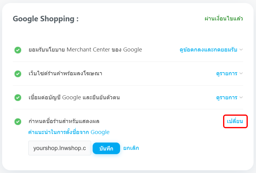 ปกติระบบจะใช้ชื่อเว็บไซต์ร้านค้าของคุณ เป็นชื่อที่ให้ Google นำข้อมูลไปแสดงผลอยู่แล้ว ทั้งนี้ คุณสามารถกำหนดชื่อร้านที่ต้องการแสดงผลเองได้ โดยคลิกเมนู เปลี่ยน และกรอกชื่อที่ต้องการ เมื่อเรียบร้อยแล้วกด บันทึก