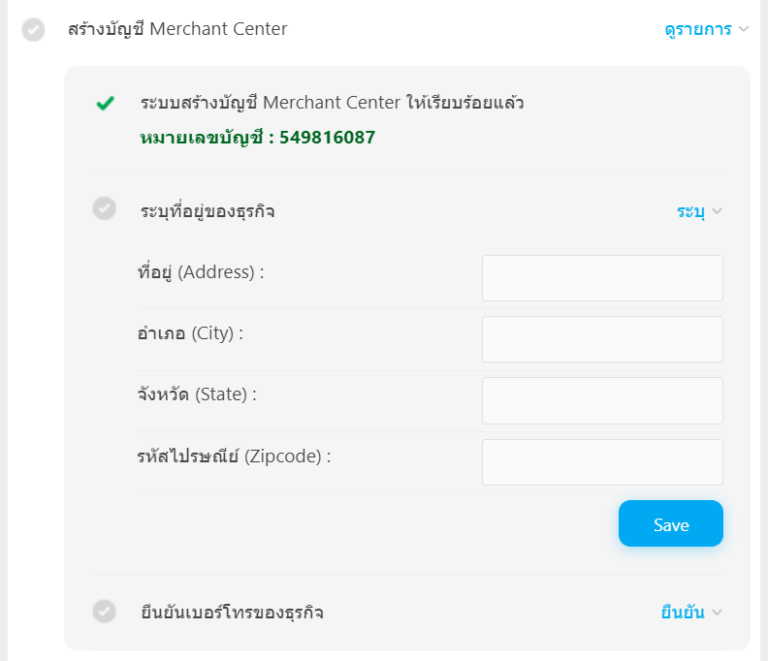 2. เมื่อระบบผูกบัญชีเรียบร้อยแล้ว ระบบจะขึ้นให้ ระบุที่อยู่ของธุรกิจ คุณสามารถกรอกข้อมูล และกด save เพื่อบันทึก