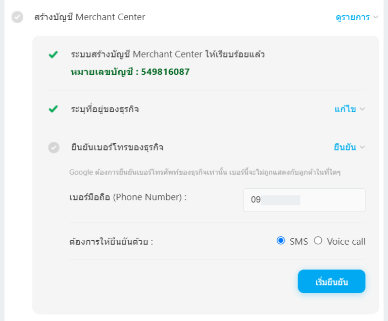 3. จากนั้น ยืนยันเบอร์โทรของธุรกิจ โดยกรอกเบอร์มือถือ และเลือกวิธีการยืนยัน > คลิก เริ่มยืนยัน และกรอก Verification code ที่ระบบส่งให้ตามช่องทางที่คุณเลือกไว้ เรียบร้อยแล้วกด Save ข้อมูลได้เลยค่ะ
