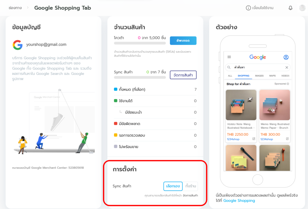 เมื่อจัดการคุณสมบัติของเว็บไซต์ผ่านครบทุกข้อแล้ว ระบบจะแสดงหน้าจัดการ Google Shopping Tab เพื่อให้คุณเชื่อมต่อสินค้าเข้าสู่ระบบของ Google โดยคุณสามารถเลือกว่าต้องการ เชื่อมสินค้าทั้งร้าน หรือเลือก เชื่อมต่อสินค้าเฉพาะบางชิ้นเท่านั้น จากนั้นรอทาง Google ตรวจสอบสินค้าภายใน 3 วัน เพื่อให้ระบบเชื่อมต่อข้อมูลสินค้าไปยังช่องทางของ Google โดยอัตโนมัติ