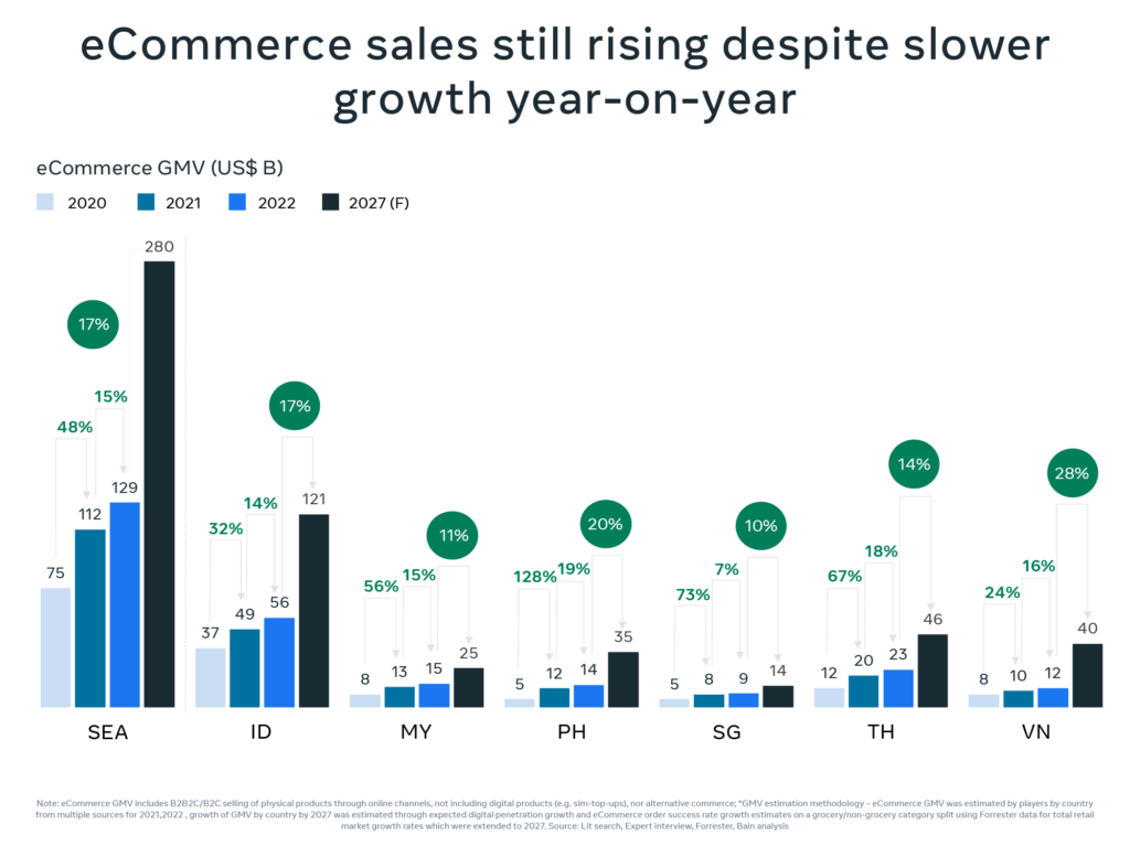 ส่วนภาพรวมการช้อปปิ้งในภูมิภาคนี้ก็ยังคงมีการเติบโต แม้ว่าจะเติบโตจะช้าลงเมื่อเทียบแบบปีต่อปี แต่มูลค่าตลาดโดยรวมของอีคอมเมิร์ซในเอเชียตะวันออกเฉียงใต้ยังคงมีแนวโน้มว่าจะเพิ่มขึ้นอย่างต่อเนื่องจนถึงปี 2027