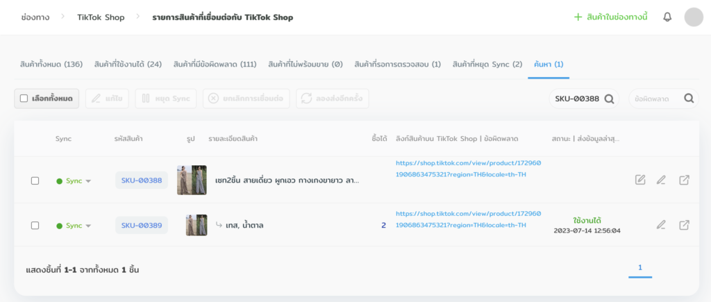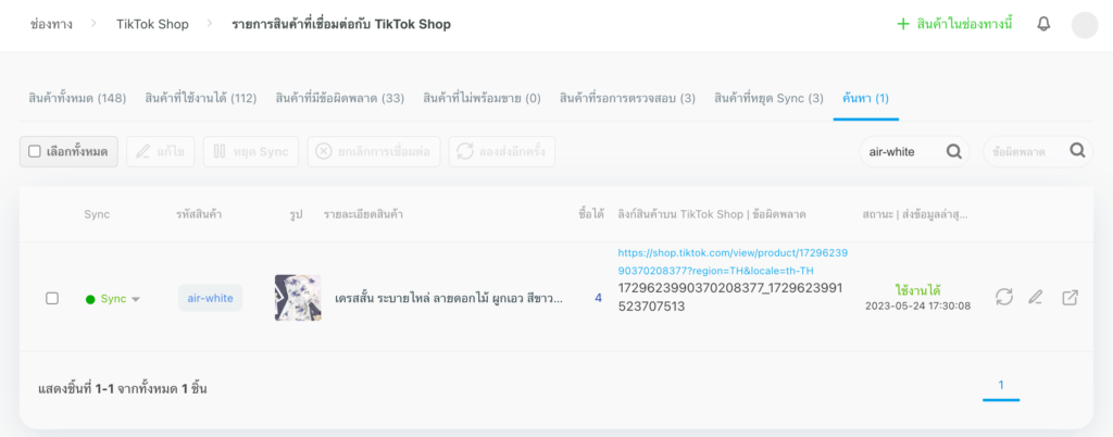 หลังจากทำการเชื่อมต่อสินค้าตามรูปแบบที่ต้องการแล้ว สินค้าจะแสดงสถานะการเชื่อมต่อในหน้า รายการสินค้าที่เชื่อมต่อกับ TikTok ที่ระบบจัดการ LnwShop Pro ซึ่งจะมีทั้งหมด 4 สถานะหลัก ได้แก่