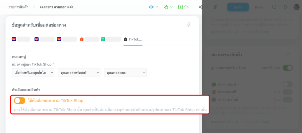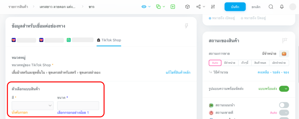 - กรณีสินค้าตัวเลือกแบบ : หลังจากกรอกข้อมูลสินค้า เช่น หมวดหมู่ เรียบร้อยแล้ว คุณสามารถตั้งค่าการใช้งานตัวเลือกแบบ ให้ระบบนำข้อมูลแบบสินค้าไปแสดงผลบน TikTok ได้ 2 รูปแบบ คือ