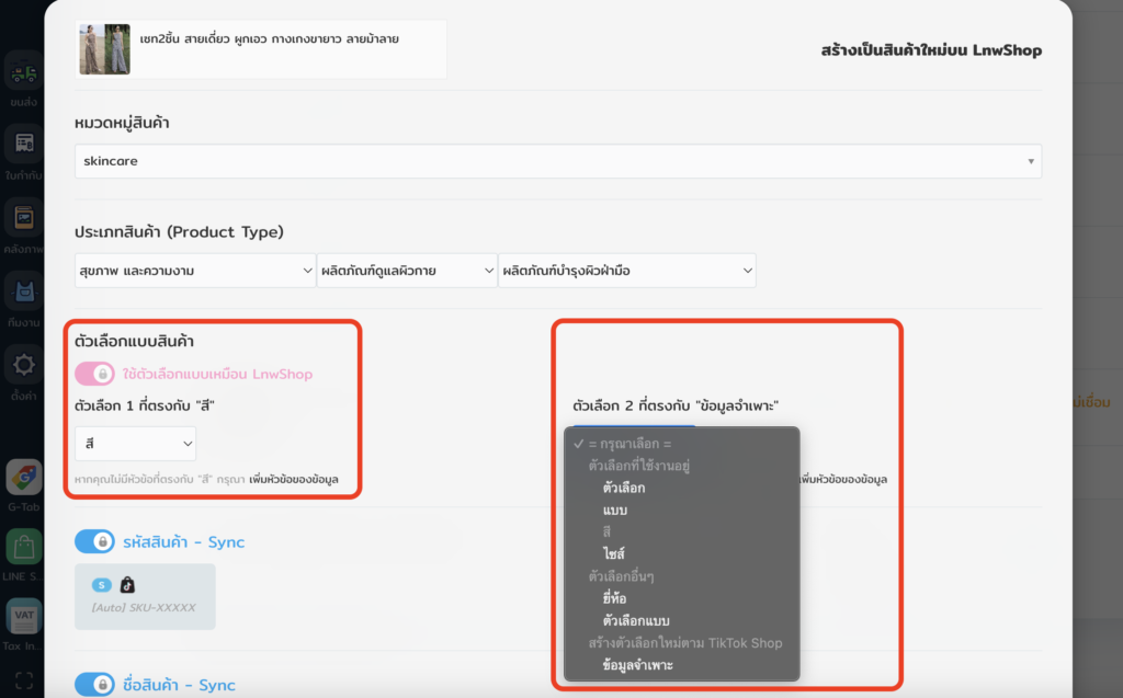 ** กรณีสินค้าตัวเลือกแบบ คุณต้องเชื่อมหัวข้อตัวเลือกแบบของ TikTok Shop เข้ากับหัวข้อของ LnwShop เช่น สี เชื่อมกับ สี ทั้งนี้ หากไม่มีหัวข้อที่ต้องการใช้งาน คุณสามารถเลือกดึงหัวข้อตัวเลือกจาก TikTok Shop มาสร้างใหม่ที่ LnwShop หรือ เพิ่มหัวข้อข้อมูลสินค้า ได้เอง