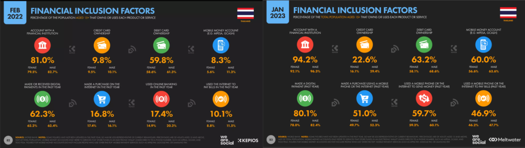 จากตัวเลขในภาพจะเห็นว่า การมีบัญชีธนาคาร และบัตรเครดิตมีปริมาณเพิ่มมากขึ้น โดยเฉพาะบัตรเครดิตที่เพิ่งมากขึ้นถึง 12.8% ในขณะที่การมีบัตรเดบิตลดน้อยลง รวมถึงตัวเลข Mobile Money Account ก็เพิ่มสูงขึ้นถึง 60% เรียกว่าโต 51.7% กันเลย ส่วนในด้านของการชำระเงินผ่านดิจิทัล ก็สูงขึ้น 17.8% การทำรายการสั่งซื้อสินค้าผ่านอินเตอร์เน็ตก็เพิ่มจาก 16.8% เป็น 51% และยังรวมถึงการโอนเงิน การจ่ายบิลผ่านออนไลน์ก็สูงขึ้นอย่างมีนัยยะสำคัญ