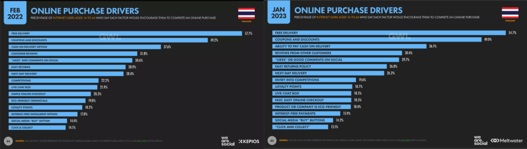 ในส่วนนี้จะเห็นว่าผลลัพธ์ของปี 2022 และ 2023 แทบจะไม่แตกต่างกันเลย ลูกค้ายังคงให้ความสนใจกับการส่งฟรี, คูปอง ส่วนลด, การเก็บเงินปลายทาง, รีวิวของลูกค้า และ Engagement บน Social ของเรา ดังนั้น E-Commerce Trend 2024 เราจึงยังต้องโฟกัสกับเรื่องเล่านี้อยู่อย่างสม่ำเสมอค่ะ