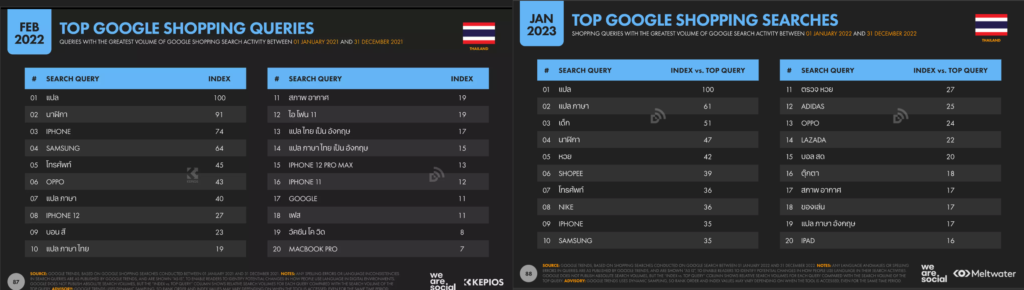 จากภาพสิ่งที่เราสามารถเห็นได้คือ ในปี 2022 จะยังไม่ค่อยมีการเสิร์ชหา Marketplace อย่าง Shopee, Lazada แต่ในปี 2023 เริ่มมีการค้นหาผ่านทั้งสองแพตฟอร์ม นั่นหมายความว่า หากในปี 2024 เรายังไม่มีการขายของออนไลน์ผ่าน Marketplate น่าจะเป็นเรื่องที่ไม่ดีกับแบรนด์ของเราอย่างแน่นอนค่ะ แต่ทางที่ดีควรจะมีทุกช่องทางการขายนะคะ เพราะการขายหลากหลายช่องทาง ทำให้เราเข้าถึงผู้คนที่หลากหลายมากขึ้นได้ค่ะ