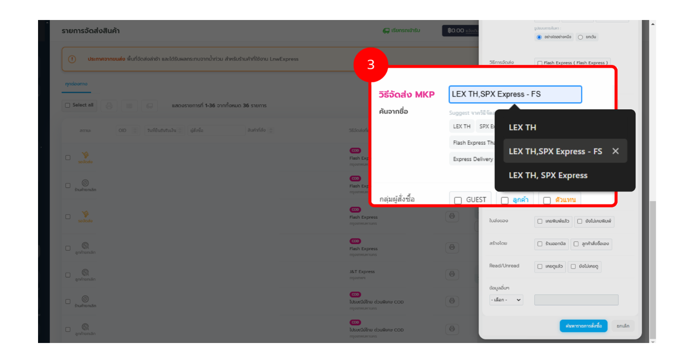 กรณีต้องการค้นหามากกว่า 1 วิธีการจัดส่ง คุณสามารถใส่เครื่องหมายจุลภาค (comma) "," คั่นระหว่างชื่อวิธีการจัดส่งได้ เช่น LEX TH,SPX Express - FS