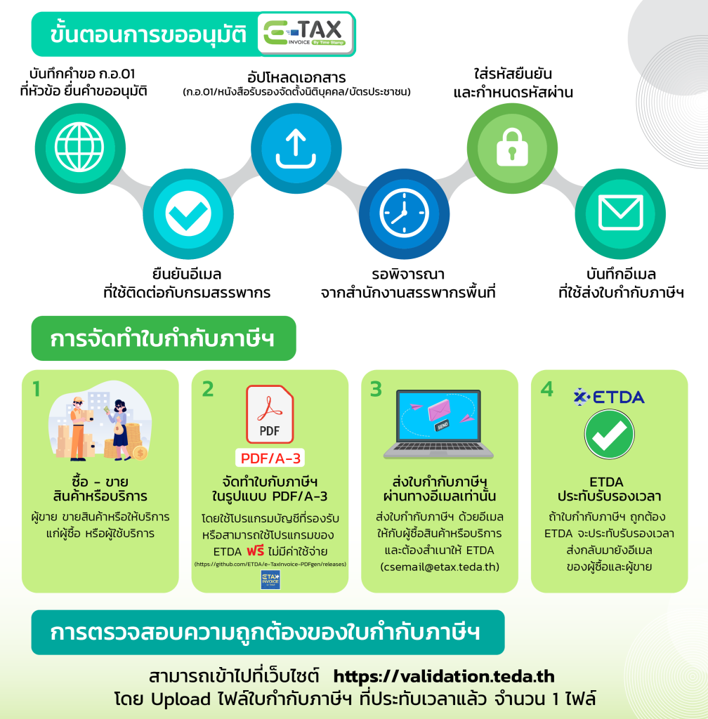 นอกจากนี้ คุณสามารถตรวจสอบสถานะใบกำกับภาษีได้ที่ https://validation.teda.th/webportal/v2/#/validate กรณีที่ใบกำกับภาษีรูปแบบ PDF/A-3 ถูกต้อง จะผ่านการตรวจสอบส่วน XML-Schema and Schematron และหากเอกสารประทับรับรองเวลาเรียบร้อย จะผ่านการตรวจสอบในส่วน PDF-Timestamp เพิ่มเติม