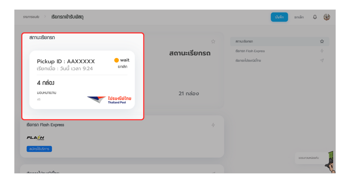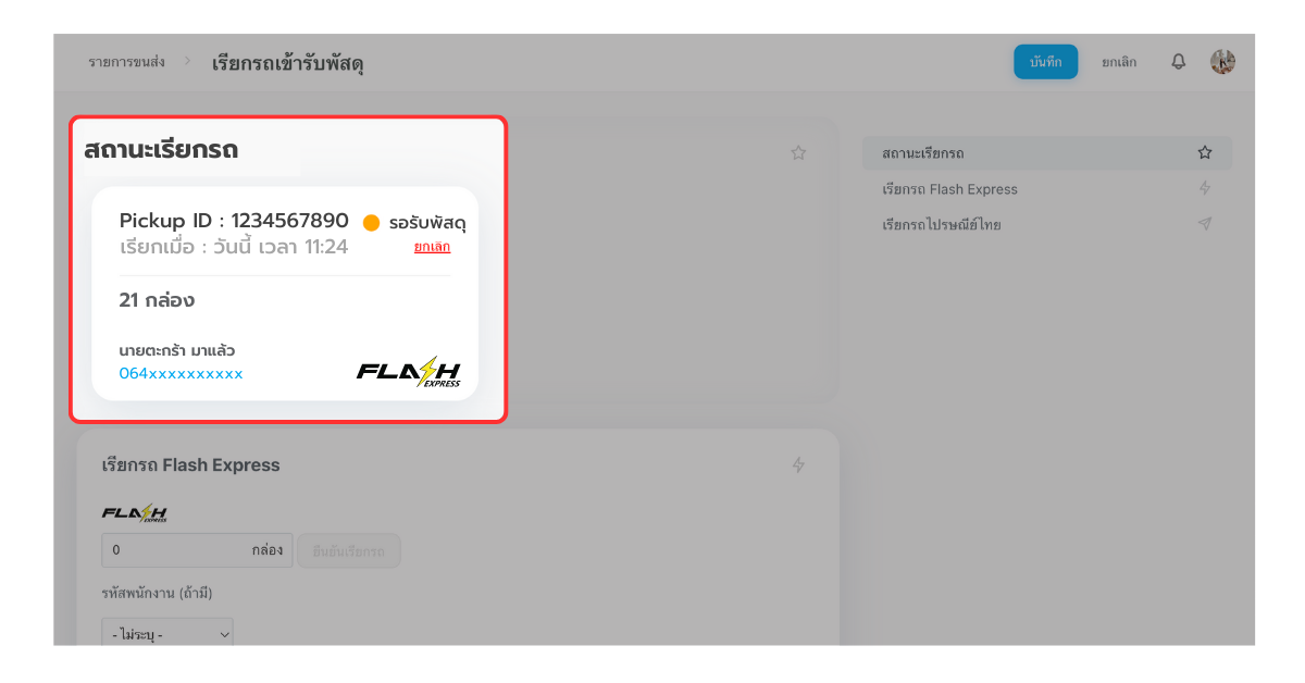 เมื่อทำการกดเรียกรถเข้ารับแล้ว จะมีกล่องข้อมูลแสดงที่ด้านบนสุดของหน้าเรียกรถ เพื่อแสดง “สถานะเรียกรถ” ทั้งหมด ที่มีการกดเรียกเข้ารับไปแล้ว โดยคุณสามารถดูข้อมูล ชื่อ/เบอร์โทรเจ้าหน้าที่รับพัสดุ และติดต่อเจ้าหน้าที่ เพื่อนัดเวลาเข้ารับพัสดุได้เลย