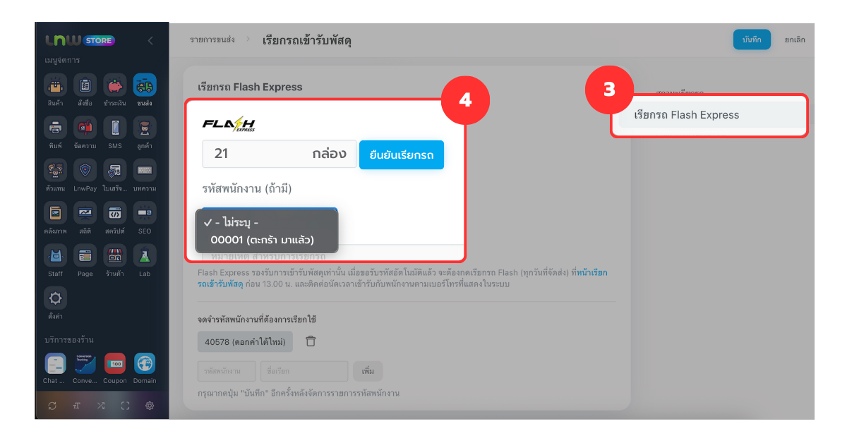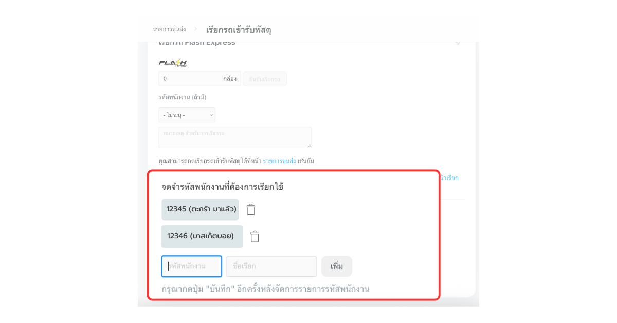 นอกจากนี้ คุณสามารถระบุรหัสพนักงาน Flash ที่ต้องการ เพื่อล็อคให้พนักงานคนนั้นเข้ารับพัสดุของร้านได้