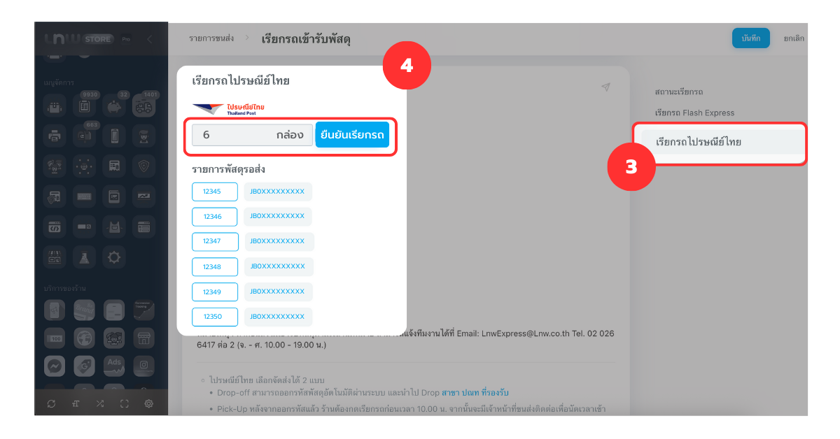 หลังจากทำการขอรับรหัสพัสดุอัตโนมัติผ่าน LnwExpress แล้ว คุณสามารถเรียกรถเข้ารับพัสดุได้ตามด้านล่าง