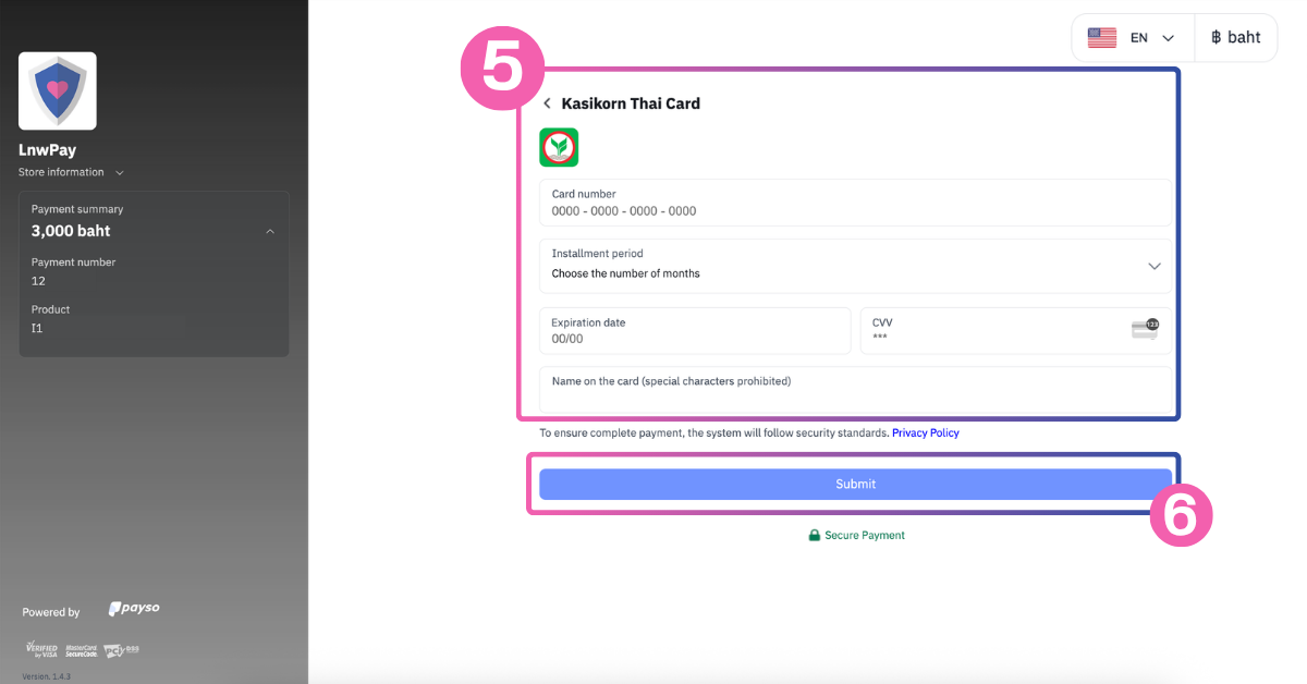 โดย LnwPay รองรับการผ่อนชำระผ่านบัตรเครดิตจากธนาคารชั้นนำ เช่น Kasikorn Thai Card, SCB Card / CardX, Bangkok Bank Card, Krungsri Card และอีกมากมาย ให้คุณช้อปได้สะดวก คล่องตัว และมั่นใจยิ่งขึ้น อย่างไรไปดูขั้นตอนการชำระเงินกันเลยค่ะ